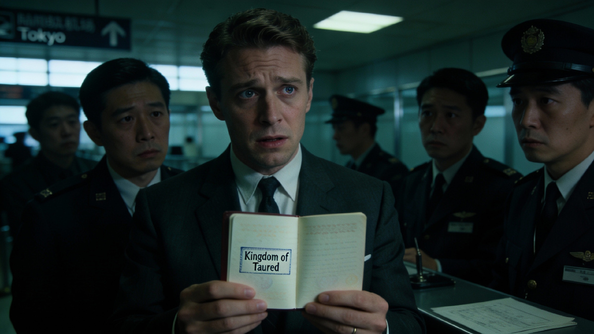 На обложке написано: «Королевство Тауред». Такой страны не существует. И никогда не существовало. Мужчину отвели в комнату для допросов. Он вел себя уверенно, говорил на французском (но знал японский) и утверждал, что это какая-то глупая шутка. Полиция была в замешательстве. Мужчину решили поселить в отель рядом с аэропортом до выяснения обстоятельств.