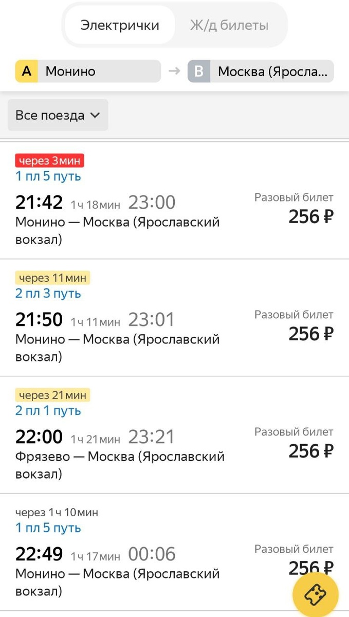 Цены на электричку из Монино в Москву с понедельника 12 января 2026. Было 232р.