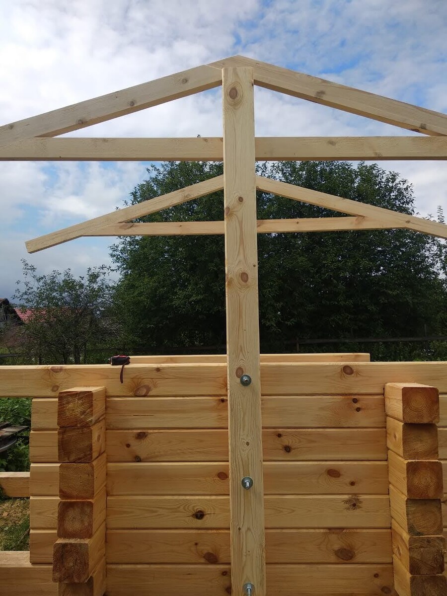 Продолжаю историю о строительстве домика для колодца. В предыдущих публикациях я рассказывала, как готовили площадку и собирали сруб. Теперь пришло время возводить крышу. Мы решили сделать её двухскатной и покрыть металлочерепицей. Сначала установили опорные стойки из того же бруса 150х150 мм, что и сруб. Чтобы они плотно прилегали к конструкции и надёжно держали вес, в местах соприкосновения с брусом мы сняли половину его толщины - получилось, что стойки как бы насаживаются на сруб. Таким образом, вся нагрузка от крыши перенесена именно на него. Каждую стойку закрепили тремя шпильками диаметром 18 мм с гайками. Затем изготовили и прикрепили к стойкам стропила навеса. А вот над углом наклона крыши и её размерами мы с мужем долго спорили. В моём воображении она должна быть круче и компактнее. Первое время я даже не могла к ней привыкнуть. Но сейчас уже вижу её преимущества: под таким навесом отлично укрываться в дождь, а ступенька к колодцу остаётся сухой - вода с крыши на неё не капает