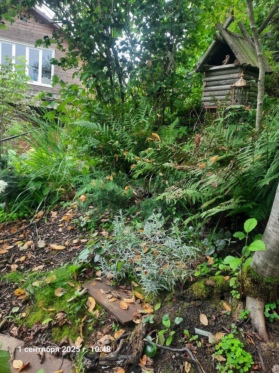 Около избушки буйствуют подросшие дикоросы. Зато вокруг "лужайки" каких красавчиков только нет. Растут они здесь в том, что было. Глинистая тяжелая почва, листоопад регулярный хоть и есть, качества земле это не сильно добавляет. Естественно, никаких рыхлений, подкормок нет. Небольшая прополка, редкие поливы, частичное мульчирование по картону центральной площадки, вокруг которой и посажены папоротники.