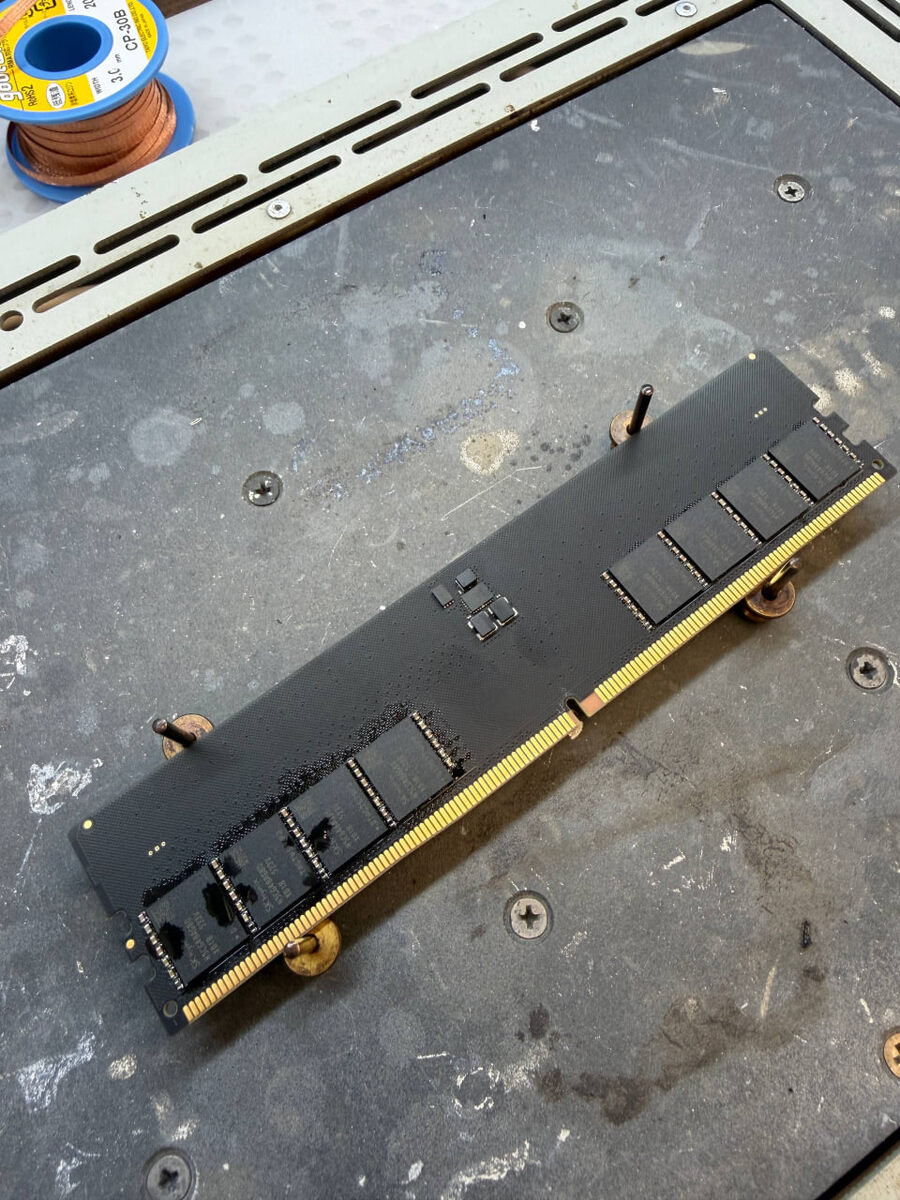 Ожидание и реальность. Переходим из теоретической плоскости в практическую. Виктор (Vik-on) все же собрал первые тестовые модули оперативной памяти. Но не так, как планировалось. Забегая вперед, получилось не идеально, но хорошо. В теории максимальная экономия достигалась покупкой ноутбучных модулей на 8 гигабайт. Они самые дешевые. Но на практике, выяснилось, что это M-die чипы и у них другая корпусировка. В теории есть готовые платы, чтобы можно было собрать 16 гиговые модули на M-die, но их в продаже не удалось найти. Поэтому, в качестве доноров памяти было принято решение использовать SO-DIMM модули на 16 гигабайт Hynix A-die 5600 MT/s, чтобы в итоге получить память для десктопа на 32 гигабайта одним модулем. Этот момент поднял итоговую стоимость – за 1 модуль 8000 рублей, то есть на 1 итоговый модуль себестоимость памяти – 16 000 руб. Далее сама плата ~600 руб. и 900 руб. обошелся радиатор, чтобы модуль выглядел дорого-богато. Необязательное, но приятное дополнение. Итого, моду