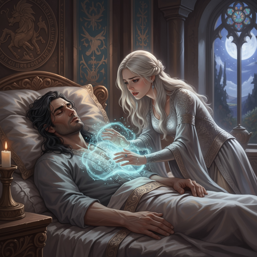 Дарн Каэнарр лежал, глаза его были закрыты, тёмные волосы разметались по подушке, нос заострился, лицо было бледным, он был похож на восковую куклу, я однажды видела такие в прошлой жизни, в страшном музее восковых фигур. Кому-то может нравится такое, но меня эти «куклы» пугали.