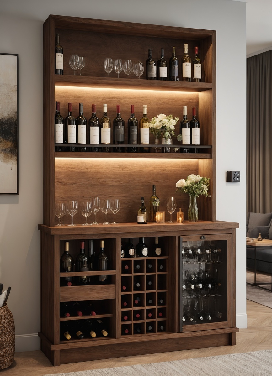 Мини-бар может быть оформлен в различных стилях, от классики до современности и эклектики. Классический стиль предполагает использование натурального дерева, витражного стекла и традиционных форм. Такие элементы, как резьба и антикварная фурнитура, создают атмосферу уюта и элегантности. Современный стиль, наоборот, характеризуется минимализмом, стеклянными и металлическими поверхностями, а также яркими акцентами, что придаёт пространству динамичность и свежесть.