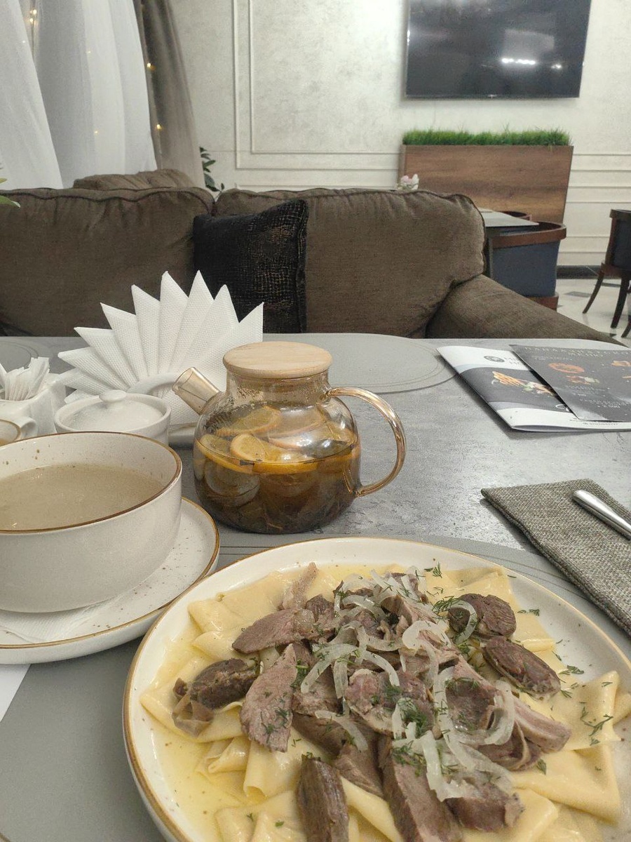 🥘 Перепробовал много всего в Средней Азии за несколько дней. Успел попробовал Бешбармак, просто пальчики оближешь. Бешбармак — традиционное блюдо народов Средней Азии, основой которого служат отварное мясо, домашняя лапша и луковый соус. Название переводится как «пять пальцев», потому что традиционно блюдо едят руками. Рекомендую 👍
