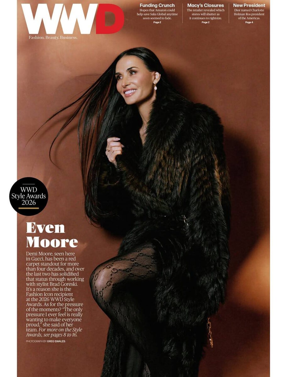 Деми Мур стала героиней нового выпуска WWD - издание выпустило съёмку с актрисой и большое интервью, приуроченное к награде Fashion Icon, которую актриса получит в 2026 году на WWD Style Awards. В кадре Деми появляется в двух тотал-образ Gucci из дебютной коллекции Демны La Famiglia. Напомню, что именно Мур исполнила главную роль в фильме The Tiger, который стал для Демны такой необычной, кинематографичной презентацией первого видения бренда. Хочется отметить,как ей идёт новый Gucci - и то, что ей подобрали для фильма, и наряды в этой съёмке. Вещи очень органично вписываются в её такой томный образ. В материале Мур говорит о моде как о способе чувствовать момент и рассказывать историю. Она вспоминает разные этапы карьеры, творческие риски, ошибки и долгие отношения с людьми, с которыми работала годами (прежде всего со стилистом Брэдом Горески). Как вам? Больше в тгк Историк Мод Анатоль Вовк.