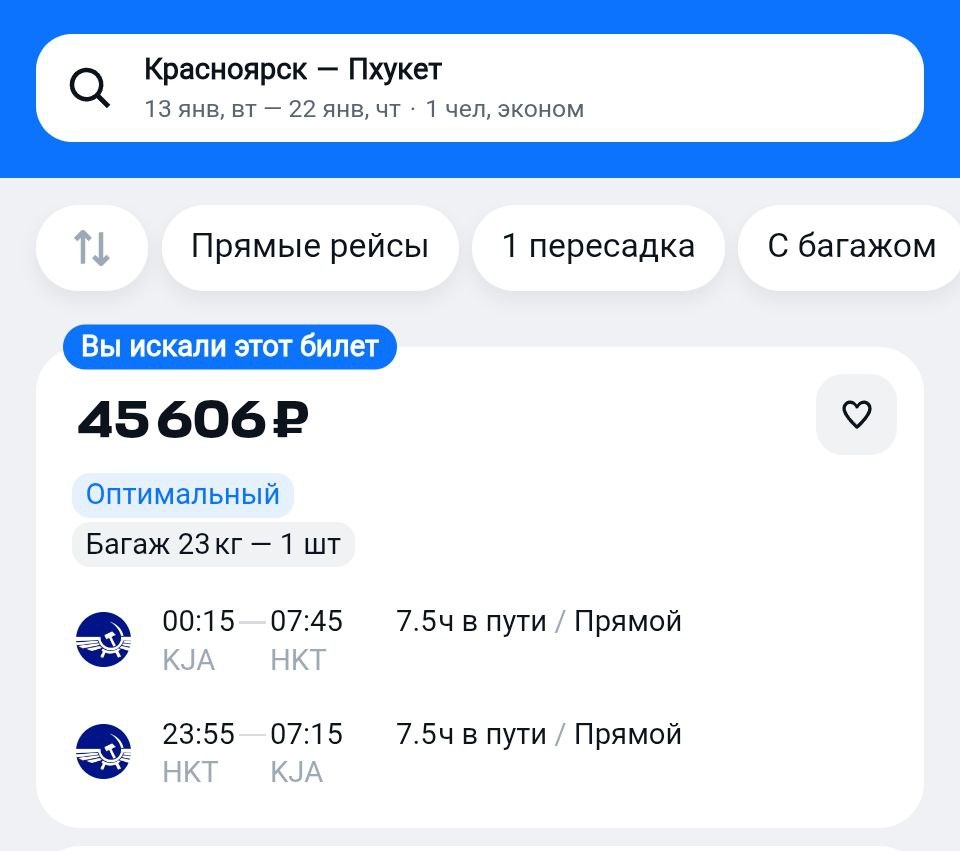 " https://aviasales.tpm.lv/ThRGs85s Также у нацперевозчика снова имеется мильная акция в Таиланд на январь. И в Бангкок (дат много), и на Пхукет (дат мало). Билеты по милям только туда! Увы. #HKT #BKK @KJA