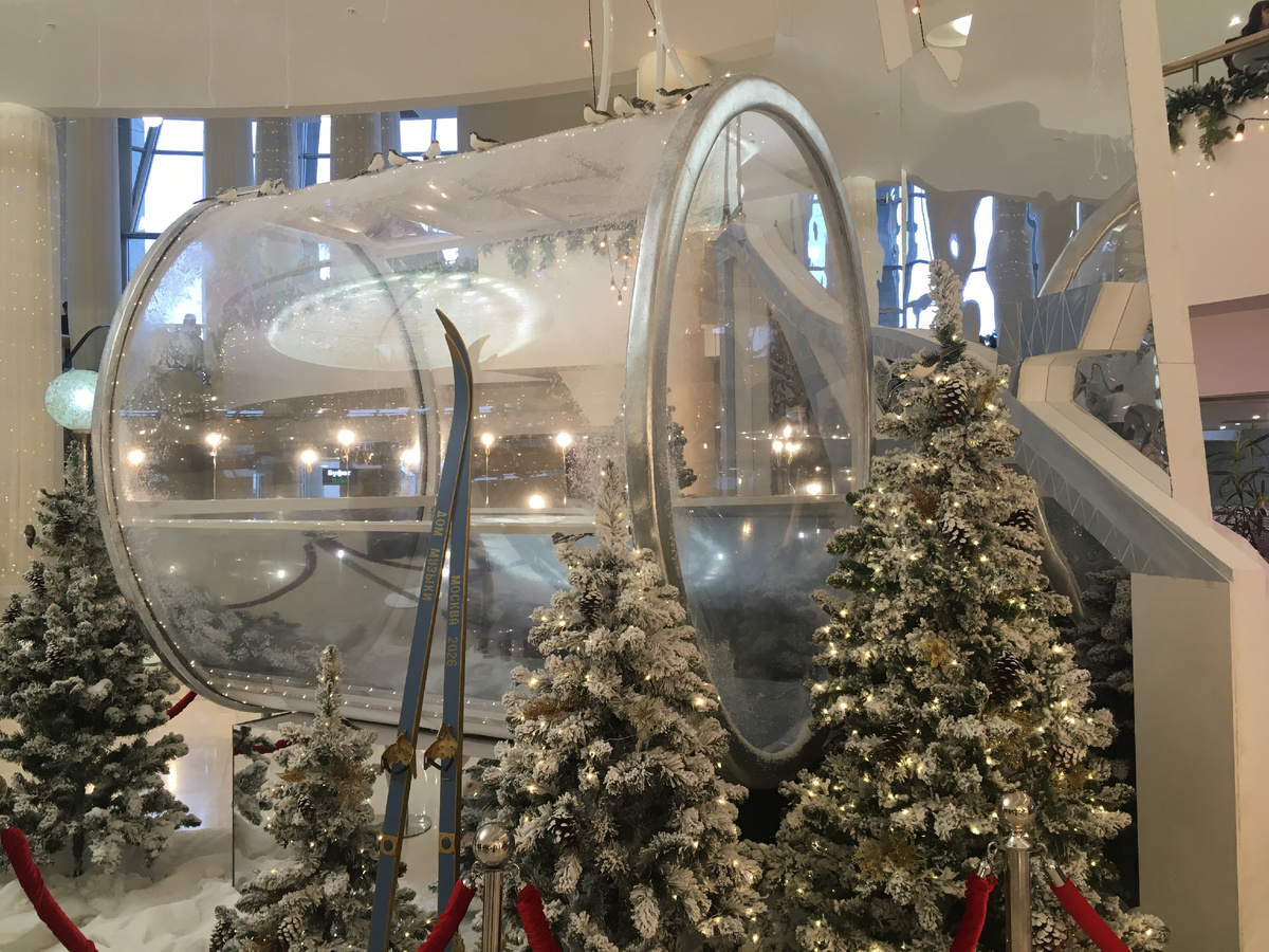 А большую новогоднюю ель, наряженную в бело-золотой гамме, декораторы в этот раз установили на втором этаже, в фойе Светлановского зала ММДМ - у застеклённой галереи, напротив центральной лестницы, расположенной между двумя эскалаторами.