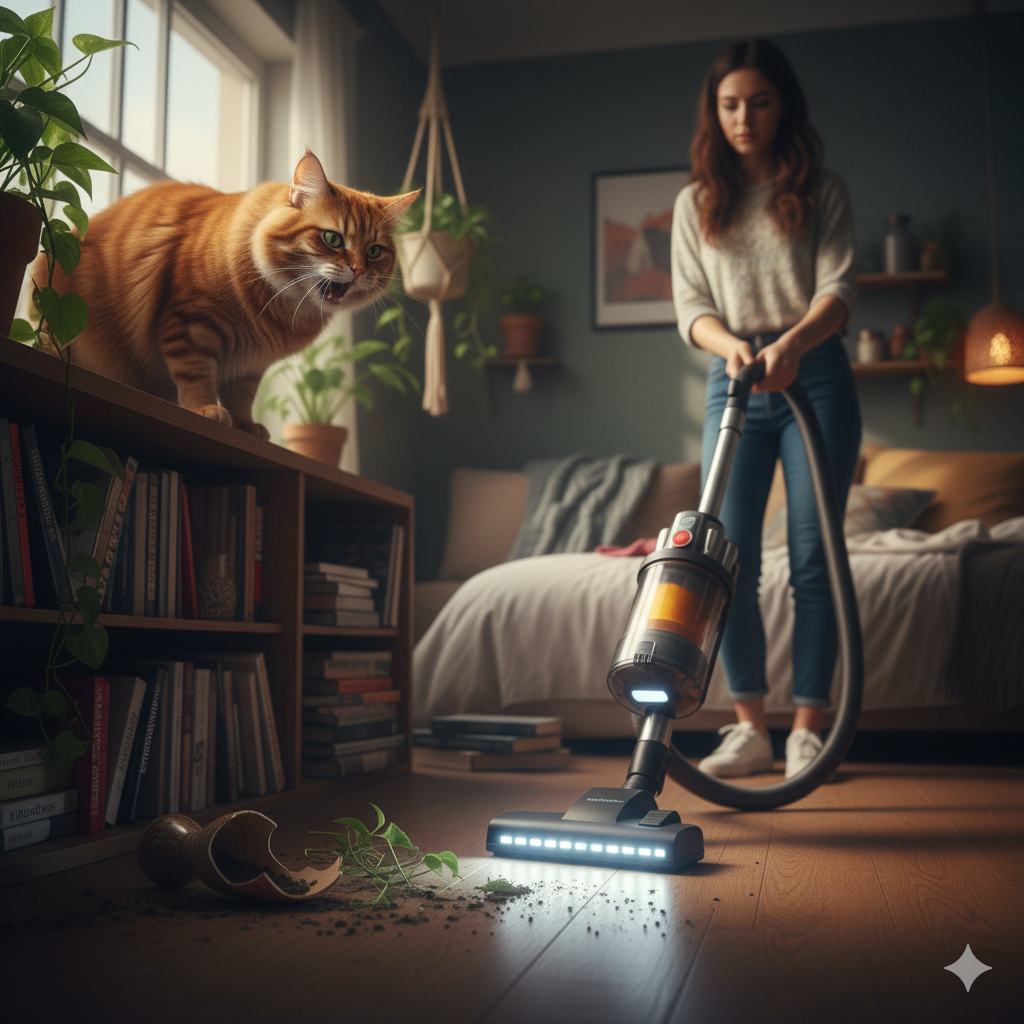 10:00. Мир перевернулся. Из шкафа выкатили ОНО. Чудовище. Ревёт как сто голодных собак, ползает по полу и ЖРЁТ всё подряд! Я, ветеран уличных боев, впервые в жизни испытал панику. Запрыгнул на самую высокую полку и зашипел. Кожаная сказала: "Котик, это пылесос, он не кусается". Она явно недооценивает масштабы угрозы. Какое "не кусается"? Оно ест грязь, пыль, мои волоски! А что, если оно меня съест? Что тогда будет с домом? Кто будет контролировать Кожаную?