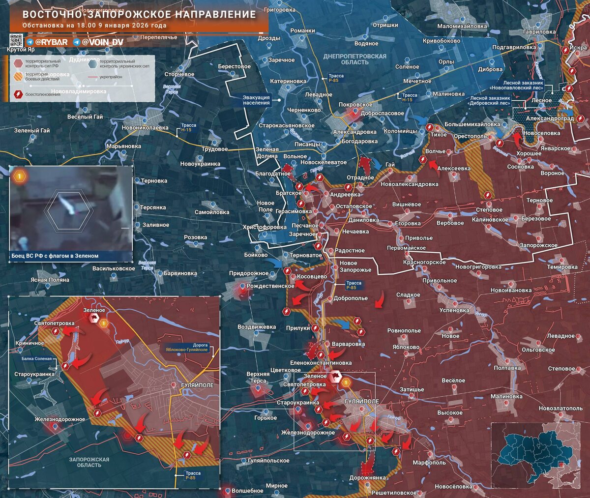Несмотря на новогодние каникулы, наша армия продолжает освобождать свою землю от бандеровской нечести. Объявлено об освобождении Зеленого. Это Запорожская область, Восточно-Запорожское направление. Отличилась группировка войск «Восток» Зеленое — село в Гуляйпольском районе Запорожской области. Расположено на правом берегу реки Гайчур, в 4,5 км от Гуляйполя на трассе, соединяющей Гуляйполе с Покровским Днепропетровской области. Ждем хороших новостей. Да здравствует русская армия! Да здравствует русский солдат!