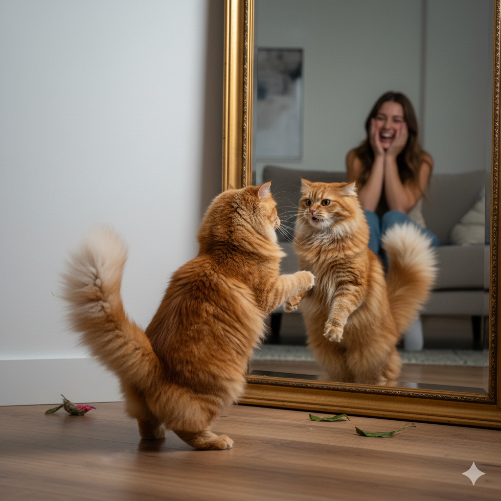 10:00. Великое Открытие. И Великая Битва. Я вошел в какую-то комнату (называется "спальня", очень скучно) и вдруг увидел ЕГО. Другого кота! Точь-в-точь как я, только наглее и бесцеремоннее. Он стоял прямо передо мной, нагло глядя в мои глаза! Я выгнул спину, распушил хвост, зашипел. Он тоже! Я сделал выпад лапой – он повторил! Это наглец, дерзкий захватчик! Началась битва! Я прыгал, царапал воздух, рычал. Он тоже. Кожаная зашла, увидела меня, стоящего на задних лапах перед большим блестящим стеклом, и начала хихикать. «Рыжий, ты что, дерешься со своим отражением?» С каким отражением? Ты что, слепая? Здесь настоящий конкурент! Но она не поняла. Наверное, решила, что я просто тренируюсь перед зеркалом.