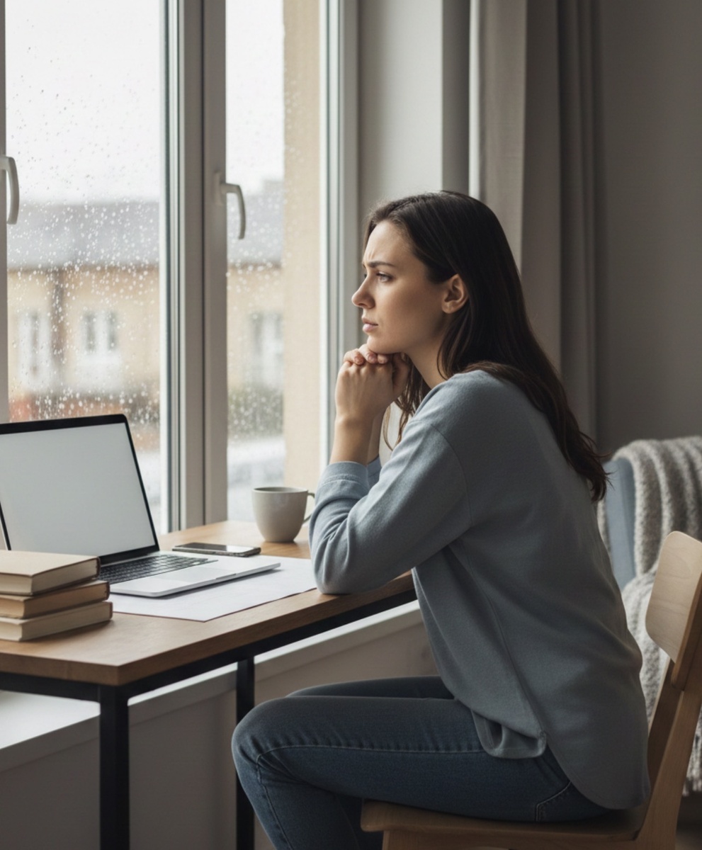 Сергей ждёт ответа о повышении на работе. Компания стабильна, но мысли о том, что будет «если не повысят», повторяются снова и снова. Он проверяет почту каждые 10 минут и не может сосредоточиться на текущих делах.