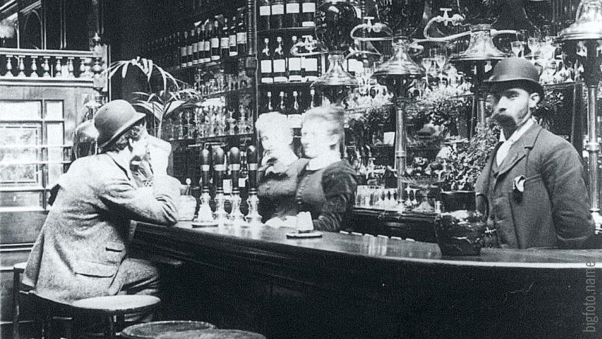 Количество пабов (public houses) – непритязательных питейных заведений – в Лондоне конца XIX века было весьма впечатляющим. Так, к 1870-му году при населении около четырех миллионов человек в городе насчитывалось около 20 000 пабов и пивных магазинчиков. Интерьер был довольно простым: стойка, за которой были выставлены бутылки с наклейками разных цветов, стулья, скамьи, столы, плевательницы, посыпанный опилками пол. На карте 1899-го года отмечены пабы в центральной части Лондона. Из пояснений следует, что здесь проживало примерно 50 000 человек, а количество пабов составляло 259 единиц, т.е. один паб приходился на 193 жителя. Приезжему, который стал бы спрашивать дорогу, могли ответить примерно так: «Идите прямо до "Трех турок", там направо, перейдите улицу у "Собаки и утки", потом опять прямо до "Медведя и бутылки", заверните за угол у "Веселых старых петухов", и, когда пройдете "Ветерана", "Гая Фокса" и "Железного герцога", первый поворот направо – и вы на месте». Википедия. П. Ак