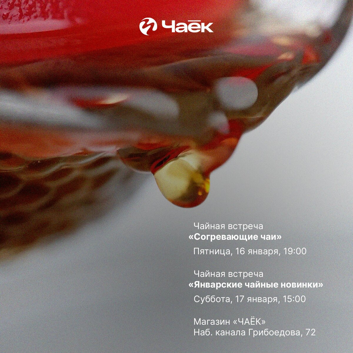 1. «Согревающие чаи» Приглашаем всех, кто желает тепла и вкусного горячего чая! На чаепитии насладимся специальной подборкой сортов, которые прекрасно согревают и подходят для создания уюта. 📅 Пятница, 16 января, 19:00 👤 Юля 💵 1 000 ₽ 2. «Январские чайные новинки» Проведём день за дегустацией восхитительных чаёв, которые приехали к нам в этом месяце. Это отличная возможность выйти за пределы привычных вкусов, обогатить свою чайную коллекцию и открыть для себя новые оттенки и ароматы! 📅 Суббота, 17 января, 15:00 👤 Саша 💵 1 000 ₽ 3. «Тет-а-тет» Вы можете записаться на индивидуальную чайную встречу, выбрав удобное для себя время, количество гостей и свою тему для мероприятия. 📅 Любой день 💵 от 3 500 ₽ 👉 Записаться Место встречи: магазин «ЧАЁК». Правила посещения и записи. Каждому гостю полагается бонус! #встреча@chaekshop