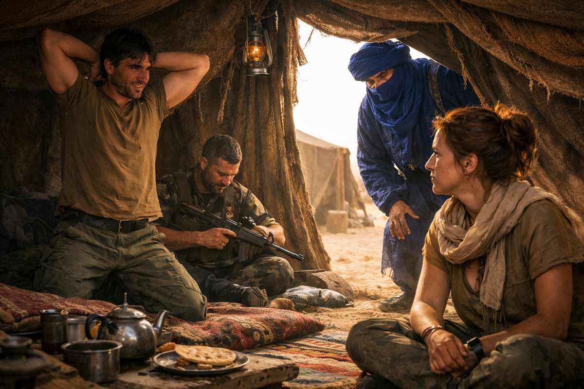 У входа в большую палатку, в стороне, стояли молчаливые фигуры, завёрнутые в тёмные ткани. При лунном свете, заливавшем серебром песок, сверкали только белки глаз, внимательных и терпеливых. Как только они вышли, эти фигуры беззвучно двинулись внутрь, к своим раненым мужчинам – их жены, матери, сестры. Забота переходила из рук чужеземных медиков в родные и заботливые.