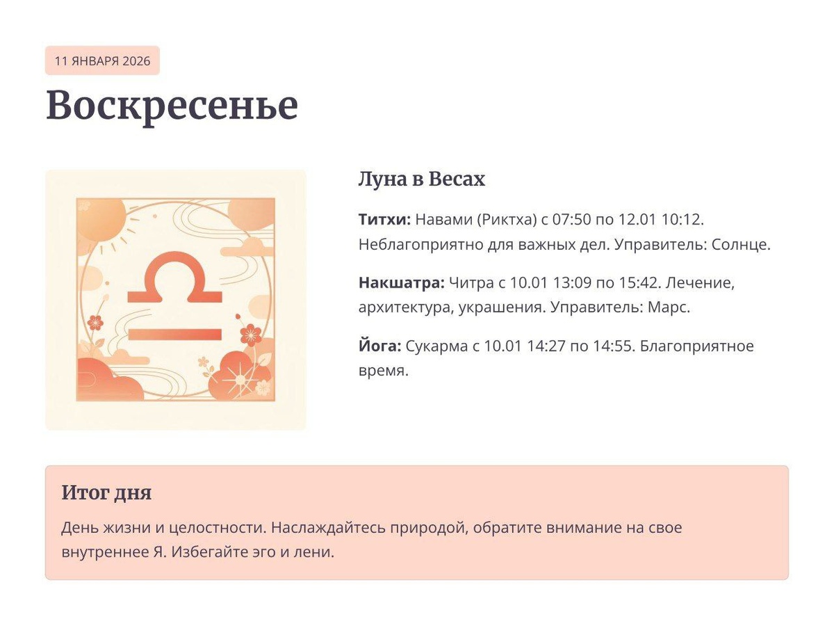 » Сегодня космос ставит на паузу кнопку «Старт». Воскресенье - не для рывка вперёд, а для того, чтобы обернуться и навести порядок в том, что уже есть. Ваша главная мантра на сегодня: «Не начинать, а завершать». 🌑 Почему сегодня «пустой» день? Идёт 24-й лунный день (Кришна Навами) - один из так называемых «рикта-титхи». Представьте, что вы между вдохом и выдохом. Энергия не для новых проектов, а для того, чтобы расчистить пространство для будущего вдоха. Практичный вывод: Не планируйте переговоры о новой работе и не покупайте билеты в путешествие. Лучше разберите шкаф или наконец доделайте тот отчёт. 🌞 Солнце - управитель дня: аодводит итог перед суровым экзаменом Солнце завершает свой путь в огненном Стрельце. Это последние дни лёгкости и веры в чудо. Через 3 дня оно войдёт в строгий Козерог - время дисциплины и реальных дел. Что делать: Честно спросите себя: какие цели последнего месяца оказались иллюзией? А какие уроки - ценным багажом? Отпустите первое, возьмите второе. 🌙