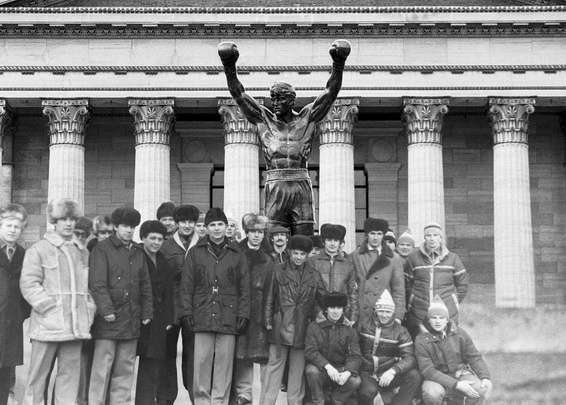 В декабре 1982 года сборная клубов СССР отправилась в очередное заокеанское турне, где ей предстояло провести серию игр против клубов НХЛ. Организаторы надеялись на то, что Федерация хоккея СССР направит в Северную Америку именно клубы, а не сборную команду, но для наших спортивных руководителей важнее была подготовка хоккеистов к предстоящему весной 1983 года чемпионату мира и Европы. Поэтому нами было поставлено жёсткое условие: или едет сборная, или не едет никто. После длительных консультаций обе стороны всё же пришли к соглашению, но обиженные хозяева нашли способ хоть как-то на нас отыграться. Расписание игр составлялось таким образом, что у нашей команды совершенно не оставалось времени для полноценного отдыха. Например, добравшись днём до Эдмонтона, уже вечером хоккеисты сборной клубов СССР провели первую встречу против «Эдмонтон Ойлерз» - клуба Уэйна Гретцки. Впоследствии на вопрос канадских телерепортёров: «Где русские игроки проводят своё свободное время?», молодой нападающий советской сборной Михаил Васильев ответил: «В номере отеля. У вас очень хорошие номера в отелях». Лишь только покинув территорию Канады и перебравшись в США, гости смогли немного перевести дух. Культурная программа всегда являлась неотъемлемой частью пребывания спортсменов за рубежом. Осмотр местных достопримечательностей, походы в кино и просто пешие прогулки позволяли снять напряжение после изнурительных физических нагрузок. Поэтому, когда в Миннеаполисе у наших ребят появилась возможность сходить в кинотеатр, разумеется, никто отказываться не стал. В тот вечер на экране демонстрировалась спортивная драма Рокки-III. Картина произвела на всех неизгладимое впечатление, и в этом нет ничего удивительного, ведь даже спустя сорок с лишним лет фильм не растерял своей привлекательности и актуальности. А тогда и вовсе – американская драма произвела настоящий фурор! «Это был не закрытый показ, а поход в обычный кинотеатр», - вспоминает Владимир Мышкин. «В зале мы сидели вместе со всеми остальными зрителями. С нами был переводчик, который, максимально быстро переводил все диалоги». Незнание языка никого совершенно не смущало. «Во время просмотра нам помогал с переводом Агги Кукулович», - говорит Василий Первухин. «Но это такое кино, которое вполне можно смотреть без перевода». Доволен кинолентой остался и старший тренер гостей Виктор Тихонов: «Этот фильм нам очень понравился. Важно то, что герой фильма главную свою проблему видел в том, чтобы спорт был чистым. Чтобы чемпион добился хорошего результата не за счёт грубой силы, а за счёт того, что у него, прежде всего, должен быть развит интеллект, как в подготовке, так и в самом поединке. И второе – это то, что даже такой великий боксёр, однажды недооценил свою подготовку, и сразу поплатился за это поражением». На этом знакомство с главным героем голливудского блокбастера не закончилось. За день до игры против «Филадельфии Флайерз», хоккеисты сборной клубов СССР выбрались на экскурсию. На этот раз их путь лежал к ступеням филадельфийского художественного музея. Это было время, когда вся Филадельфия напоминала рекламную столицу очередного, третьего по счёту, фильма о боксёре Рокки Бальбоа. Кассовые сборы от проката били все возможные и невозможные рекорды. Повсюду пестрели яркие киноафиши, а глянце