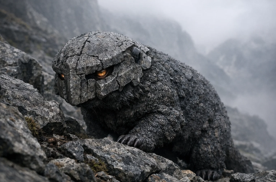 Галеамоп — не млекопитающее и не рептилия в привычном для нас понимании. Он представляет собой уникальный класс плацентарных, эволюционировавший в абсолютной изоляции на протяжении сорока миллионов лет. Его размеры сравнимы с размерами крупного барсука, но на этом всякое сходство с известной фауной заканчивается. Тело галеамопа приземистое, мускулистое, покрытое не шерстью и не чешуей, а плотной, зернистой кожей, напоминающей застывшую вулканическую породу — базальт или габбро. Окрас варьируется от темно-сланцевого с сизыми прожилками до матово-бурого, что делает животное практически неотличимым от скального субстрата, когда оно замирает.