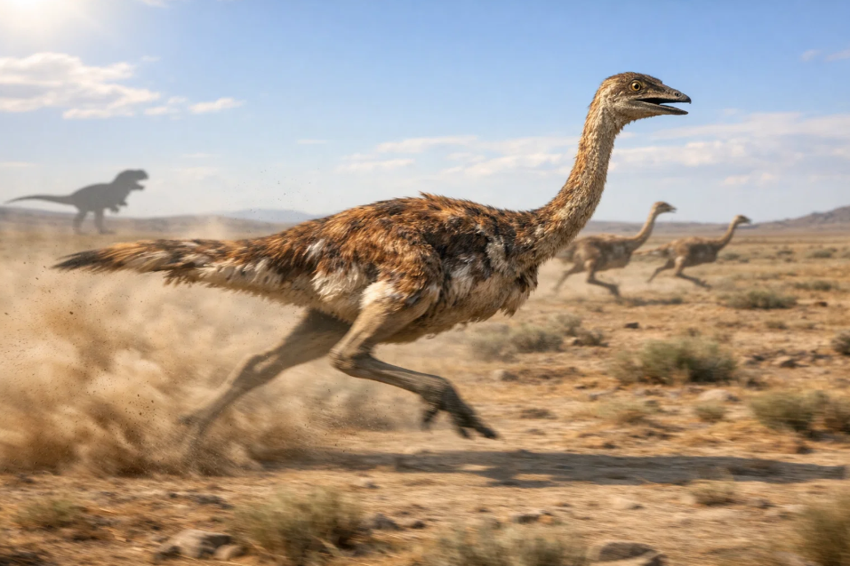 Ключевым элементом, превращавшим галлимима в живую ракету, были его задние конечности. Ноги динозавра — это шедевр биомеханики. Бедренная кость была относительно короткой, что позволяло сокращать рычаг и увеличивать частоту шагов. Зато голень и, особенно, плюсневые кости (аналог стопы) были невероятно удлиненными. Эта особенность, характерная для всех великих бегунов — от современных страусов и гепардов до вымерших хищных динозавров, — создавала эффект «дополнительного сустава». Галлимим, по сути, бегал на цыпочках, что значительно увеличивало длину шага и эффективность отталкивания от земли. Сильные, лишенные мяса плюсневые кости работали как идеальные рычаги, передавая мощный импульс от мускулистых бедер прямо в грунт. Палеонтологи, анализируя следовые дорожки и проводя компьютерное моделирование, предполагают, что галлимим мог развивать скорость до 60-70 километров в час, а на коротких дистанциях, возможно, и больше. Для сравнения, современный страус, чье строение во многом конвергентно схоже, развивает скорость до 70 км/ч. В мире позднего мела, где основными угрозами были крупные хищники вроде тарбозавра, такая скорость была главным гарантом выживания.