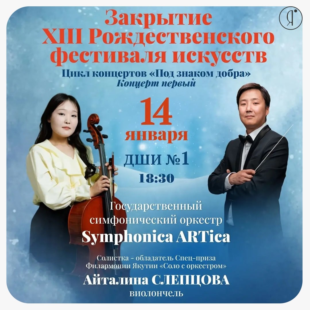 #Концерты Государственный симфонический оркестр Symphonica ARTica под управлением Максима Ноговицына исполнит произведения русских и зарубежных композиторов. С оркестром впервые выступит лауреат конкурса «Симфония добра» Айталина Слепцова (виолончель), получившая специальный приз Филармонии Якутии "Соло с оркестром". В программе: Камиль Сен-Санс – Концерт для виолончели с оркестром (солистка – Айталина Слепцова), Николай Римский-Корсаков – Сюита из музыки к опере «Сказка о царе Салтане», Пётр Чайковский – Итальянское каприччио. 14 января | 18:30 Концертный зал ДШИ №1, Ярославского, 27 500 руб. filarmony.ru Online Якутия | Ждем вас в МАХ
