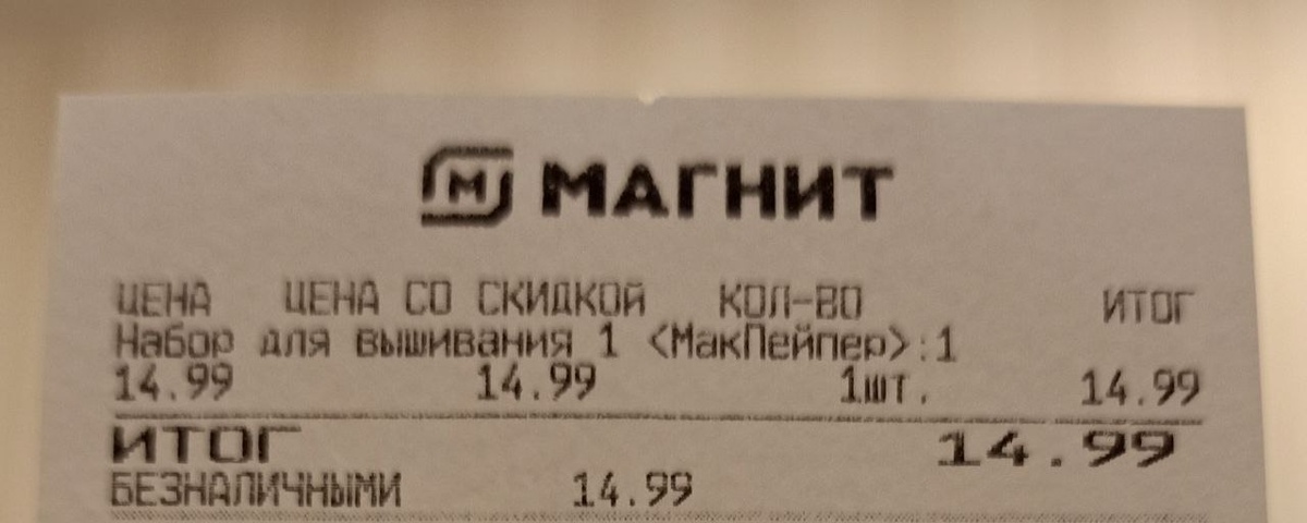 Однажды я зашла в Магнит Косметик за совсем отвлечёнными от вышивки вещами. А там... Висит набор для вышивки крестиком со скидкой. На ценнике 14.99 рублей. Сказать, что я удивилась - ничего не сказать. Видели наборы по такой цене? Я нет. На самом наборе была написана цена 149 рублей, я подумала, ладно, наверное ошибка, в любом случае возьму, посмотрю что будет на кассе. И я купила его. Набор за 15 рублей. На самом деле я немного обманула в заголовке, я не проверяла существуют ли наборы дешевле чем этот, если найдёте - напишите в комментариях. По размеру довольно маленький, 8 на 10 сантиметров, если вам неохота читать мелкий шрифт с картинки, то вкратце - нитки полиэстер, канва смесь хлопка с полиэстером 70/30, дата изготовления - август 2020-ого года. Произведён в Китае, импортёр "Академия, Ко" из Ярославля. Мини-органайзер, игла, даже инструкция есть! За 15 рублей вполне себе солидно. Это может быть такой набор для школы или для совсем начинающей вышивальщицы, чтобы просто попробовать