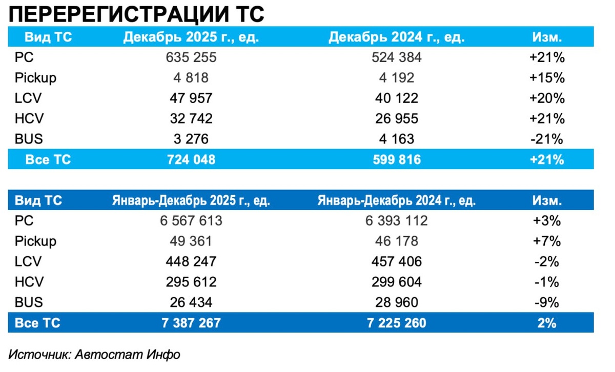 По данным «Автостат Инфо», 2025 год закрепил расхождение траекторий первичного и вторичного рынка: продажи новых машин просели, тогда как сегмент авто с пробегом в целом удержался в легком плюсе. Регистрации новых транспортных за январь–декабрь 2025 года составили 1,49 млн единиц против 1,83 млн годом ранее, минус 19%. Сильнее всего сократился тяжелый контранc: рынок новых грузовиков (HCV) упал наполовину, с 126 тыс. до 62 тыс. машин (-51%), автобусов – на 35% (с 19,7 до 12,8 тыс.). LCV показали спад на 24%, пикапы – на 25%. Даже базовый для рынка сегмент легковых (PC) снизился на 16% – с 1,55 млн до 1,31 млн регистраций. При этом декабрь выглядел заметно бодрее: в сумме оформлено 154,7 тыс. новых ТС, что на 6% больше, чем в декабре 2024-го. Рост обеспечили легковые автомобили (+11% к декабрю 2024-го) и автобусы (+13%), тогда как LCV и тяжелые грузовики в последнем месяце года еще оставались в минусе двузначными темпами. Рынок авто с пробегом, напротив, за год чуть прибавил. Общее чи
