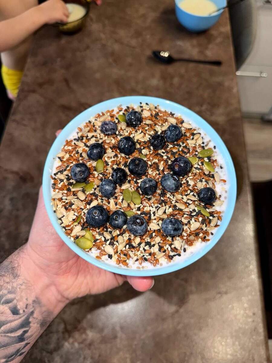 Без фанатизма, без диет, без подсчета калорий - через систему и привычки. Еще в декабре заказал себе всякие базовые штуки: • зеленую гречку • амарантовую муку • семена льна • смеси семян • семена чиа • клетчатку И начал просто пробовать разные варианты. За первые 11 дней нового года: • испек хлеб из чечевицы • начал делать муссовые десерты на базе семян чиа • чередую основы - обезжиренный греческий йогурт или обезжиренный кефир • добавляю фрукты - банан, киви, яблоко, апельсин • замороженные ягоды - вишня, смородина • орехи и смеси семян сверху Сегодня сделал сразу две версии: 1️⃣ Кефир Простоквашино с клубникой + манго, киви, яблоко, семена чиа и льна 2️⃣ Овсяные хлопья, залитые горячей водой + семена чиа + протеиновый коктейль на топленом молоке Готовится все 15 минут, дальше просто стоит в холодильнике. Лучше дать постоять 12-24 часа - и на следующий день у тебя готовый десерт. Самое важное: • без сахара • много клетчатки • хороший белок • отлично для ЖКТ • реально вкусно Для