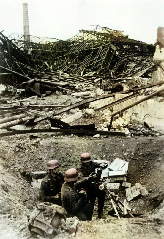 Немецкий миномётный расчёт ведёт огонь по советским войскам из 81-мм миномета (8-cm G.W.34) среди руин завода «Красный Октябрь» в Сталинграде.