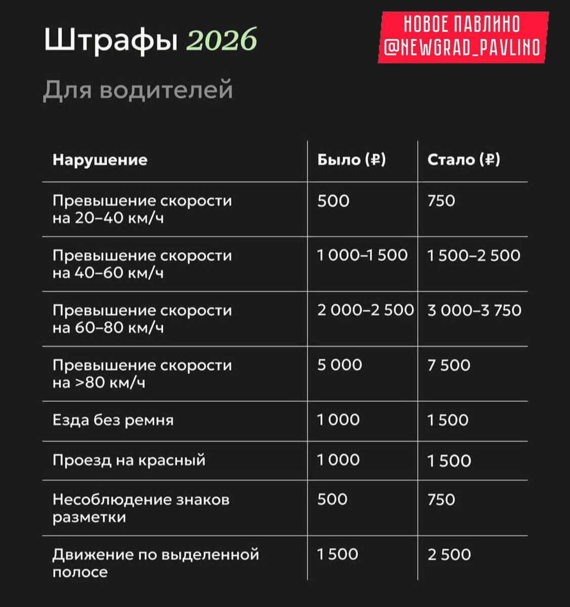 . ΠΡΠ΅Π²ΡΡΠ΅Π½ΠΈΠ΅ ΡΠΊΠΎΡΠΎΡΡΠΈ ΡΠ΅ΠΏΠ΅ΡΡ ΠΊΠ°ΡΠ°Π΅ΡΡΡ ΡΠ»Π΅Π΄ΡΡΡΠΈΠΌΠΈ ΡΡΡΠ°ΡΠ°ΠΌΠΈ, Π² Π·Π°Π²ΠΈΡΠΈΠΌΠΎΡΡΠΈ ΠΎΡ ΠΏΡΠ΅Π²ΡΡΠ΅Π½ΠΈΡ: β’ Π½Π° 20β40 ΠΊΠΌ/Ρ: 500 β 750 ΡΡΠ±Π»Π΅ΠΉ β’ Π½Π° 40β60 ΠΊΠΌ/Ρ: 1 000β1 500 β 1 500β2 500 ΡΡΠ±Π»Π΅ΠΉ β’ Π½Π° 60β80 ΠΊΠΌ/Ρ: 2 000β2 500 β 3 000β3 750 ΡΡΠ±Π»Π΅ΠΉ β’ Π½Π° Π±ΠΎΠ»Π΅Π΅ 80 ΠΊΠΌ/Ρ: 5 000 β 7 500 ΡΡΠ±Π»Π΅ΠΉ ΠΠ° Π΅Π·Π΄e Π±Π΅Π· ΡΠ΅ΠΌΠ½Ρ Π±Π΅Π·ΠΎΠΏΠ°ΡΠ½ΠΎΡΡΠΈ ΡΡΡΠ°Ρ ΡΠ²Π΅Π»ΠΈΡΠ΅Π½ Ρ 1 000 Π΄ΠΎ 1 500 ΡΡΠ±Π»Π΅ΠΉ. ΠΠ° ΠΏΡΠΎΠ΅Π·Π΄ Π½Π° ΠΊΡΠ°ΡΠ½ΡΠΉ ΡΠΈΠ³Π½Π°Π» ΡΠ²Π΅ΡΠΎΡΠΎΡΠ° ΡΡΡΠ°Ρ ΡΠ°ΠΊΠΆΠ΅ Π²ΡΡΠΎΡ Ρ 1 000 Π΄ΠΎ 1 500 ΡΡΠ±Π»Π΅ΠΉ. ΠΠ° Π½Π΅ΡΠΎΠ±Π»ΡΠ΄Π΅Π½ΠΈΠ΅ Π·Π½Π°ΠΊΠΎΠ² ΠΈ ΡΠ°Π·ΠΌΠ΅ΡΠΊΠΈ ΡΡΠΌΠΌΠ° ΠΈΠ·ΠΌΠ΅Π½ΠΈΠ»Π°ΡΡ Ρ 500 Π΄ΠΎ 750 ΡΡΠ±Π»Π΅ΠΉ. ΠΠ° Π΄Π²ΠΈΠΆΠ΅Π½ΠΈΠ΅ ΠΏΠΎ Π²ΡΠ΄Π΅Π»Π΅Π½Π½ΠΎΠΉ ΠΏΠΎΠ»ΠΎΡΠ΅ Π΄Π»Ρ ΠΎΠ±ΡΠ΅ΡΡΠ²Π΅Π½Π½ΠΎΠ³ΠΎ ΡΡΠ°Π½ΡΠΏΠΎΡΡΠ° ΡΡΡΠ°Ρ ΡΠ΅ΠΏΠ΅ΡΡ 2 500 ΡΡΠ±Π»Π΅ΠΉ Π²ΠΌΠ΅ΡΡΠΎ 1 500 ΡΡΠ±Π»Π΅ΠΉ. ΠΡ Π² π² max.ru/newgrad_pavlino β οΈΠΠΠΠΠ ΠΠΠΠΠΠΠ πππππππ΄ ΠΡΠΈΡΠ»Π°ΡΡ Π½ΠΎΠ²ΠΎΡΡΡ|ΠΠΎΠ΄ΠΏΠΈΡΠ°ΡΡΡΡ β€οΈ
