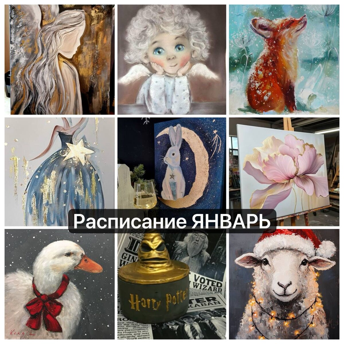 : ✨11.01(вскр.)/15:00/ живопись «Дружок» ( можно взрослый +ребенок) 6+ ✨14.01(ср.)/19:00живопись «Ангел»-1700 руб (холст на подрамнике 30*40см.) ✨16.01(пт.)/19:00 фактурная живопись «Цветок» или «Абстракция», материалы: акрил, поталь, текстурная паста , холст на подрамнике ( 30*40 см - 1500руб. , 40*50 и 40*40 см -1900 руб.) ✨17.01 (сб.)/16:00 украшения из эпоксидной смолы - 1000 руб ( с подругой скидка 10%) . ✨17.01 (сб.)/18:00 - живопись «Твой сюжет» ( можно выбрать из наших или принести свой)- от 1500 руб. ✨18.01 (вскр.)/13:00 лепка фигурки «Ангел» из полимерной глины -1500 руб. ✨18.01 (вскр.)/16:00 живопись «Крещение» (уровень сложности 7+)- 1200 руб ( холст на картоне 30*40 см) , 1700 руб (холст на подрамнике 30*40 см) ✨21.01(ср.)/14:00 лепка украшений из полимерной глины и эпоксидной смолы - 1000 руб. ✨21.01(ср.)/19:00 живопись «Зимний пейзаж»- 1700 руб.( холст на подрамнике 30*40 см 1700 руб. ✨23.01(пт.)/19:00 фактурная живопись «Сомы», «Перо». материалы: акрил, поталь, тексту