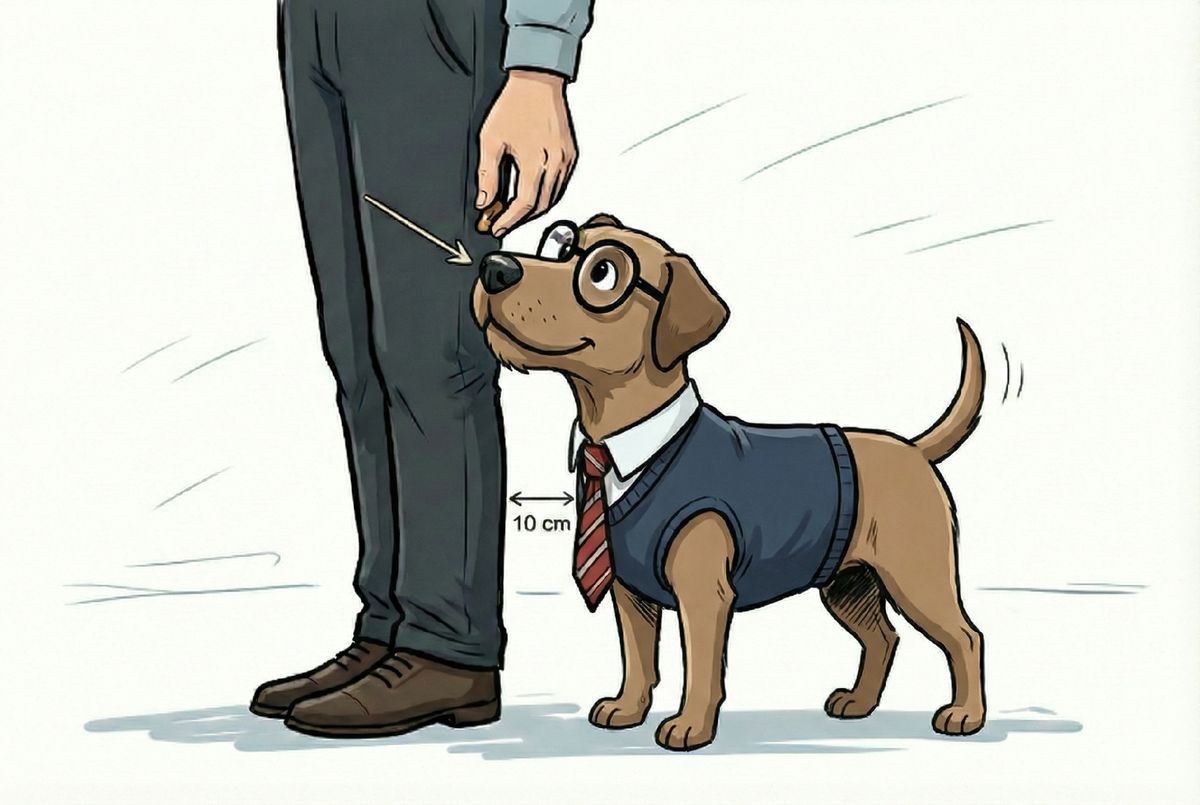 Собака обычно стремится в ту точку, где она получает кусочек. Если кусочек выдается в неправильном месте, позиция, как правило, получается косенькая. Но случается и обратная ситуация: кусок вроде ждет собаку там, где нужно, а позиция все равно такая себе. Тогда мы можем исправить ситуацию, немножко откалибровав точку выдачи, сместив ее исходя из задачи. Пока путано, но сейчас станет понятнее.