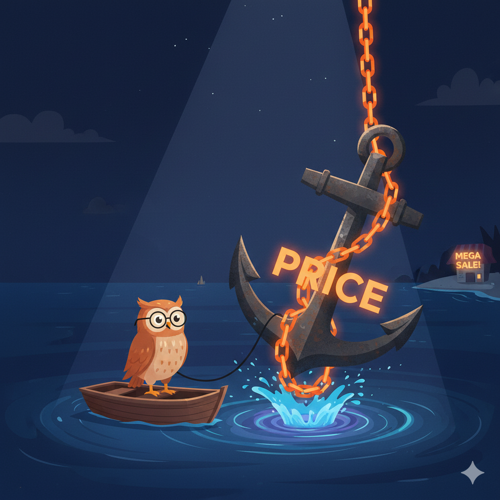 Когда мозг сталкивается с неизвестностью (сколько стоит этот товар? какой этот человек?), он ищет точку опоры. И первое, что попадается на глаза, становится таким «якорем». Даже если эта информация совершенно нерелевантна, она задает рамку для дальнейших оценок. 💰 Мастер ценообразования