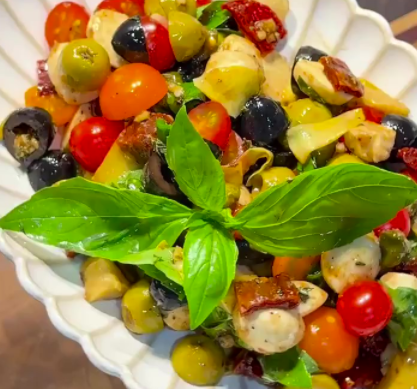 Данная закуска станет центральным блюдов вашего праздничного стола. Собранная из традиционных продуктов с нотками Азии, она вызовет настоящий гастрономический оргазм у любителей идеальных салатов. Рекомендую продемонстрировать её гостям, удивив их своими кульнарными возможностями. Непосредственно для изготовления салата нам понадобятся следующие ингредиенты: Дополнительно к салату делаем заправку: - соус Ким Чи 15 мл.; - бальзамический уксус 15 мл.; Каждый оливок режем пополам, остальные ингредиенты подгоняем под этот размер или делаем чуть мельче. Далее занимаемся заправкой, соединяя все её составляющие и взбивая венчиком. Должна получиться немного густая эмульсия. Соединяем всё вместе и даём постоять минут 10. Салат готов. Настоящее кулинарное чудо, пальчики оближешь. Таким салатом можно наполнять тарталетки, подавать как самостоятельное блюдо, гарнир к рыбе и т.п. Экспериментируйте!