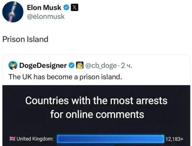 социальных сетях. Статистика, господа и дамы, просто статистика... Илон Маск назвал Великобританию тюремным островом. Он показал статистику, согласно которой в Великобритании за год произошло 12183+ арестов из-за комментариев и постов в соцсетях. Большинство таких арестов связано с критикой и оскорблениями в адрес мигрантов. В среднем там ежедневно фиксируют около 30 арестов за подобные посты или комментарии, а это в среднем 12 тысяч в год. Источник: Кушвинская Правда Источник: Открыть