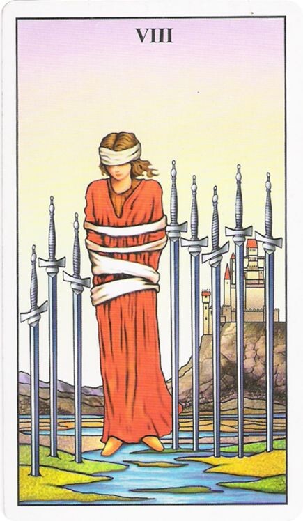 Дорогие искатели знаний, сегодня мы поговорим о карте, которая часто вызывает тревогу - Восьмёрка Мечей из колоды Райдера–Уэйта. На первый взгляд она кажется приговором: женщина, связанная, слепая, окружённая мечами… Но если присмотреться внимательнее - вы увидите, что никто не держит её насильно. Оковы легко снять. Путь свободен. Эта карта - не приговор, а зеркало. Она показывает, как наши страхи, самоограничения и внутренние установки могут заточить нас сильнее любой темницы. Сегодня мы разберём её символику, магическое значение и главное - что делать, когда эта карта появляется в раскладе. Особенно важно - не пропустить её предупреждение. На карте изображена женщина в белом одеянии, стоящая в болотистой местности. Её руки связаны, глаза повязаны, вокруг - восемь мечей, воткнутых в землю. На заднем плане - замок на холме и река, текущая к горизонту. Белое платье - символ чистоты намерений и невинности, но также и наивности.