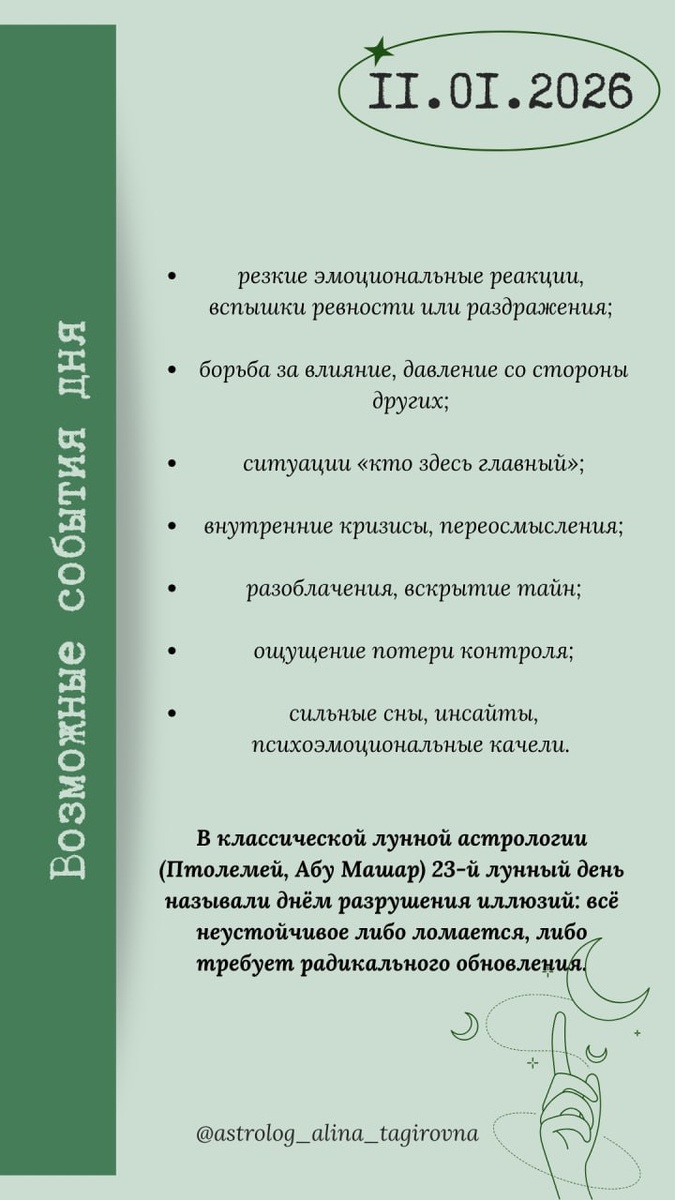 1️⃣1️⃣ января, воскресенье В 01:50 начало 2️⃣3️⃣-го Лунного дня Убывающая Луна в знаке ♏️Скорпион Общая характеристика дня 11 января — один из самых напряжённых и трансформационных дней лунного месяца. 23-й лунный день в астрологической традиции считается днём испытаний, скрытых процессов и проверки силы духа. В сочетании с Луной в Скорпионе и квадратурой к Плутону он поднимает на поверхность темы власти, контроля, подавленных эмоций и глубинных страхов. Это день, когда бессознательное становится особенно активным: ➖могут всплывать старые обиды; ➖усиливаются крайности в эмоциях; ➖обостряется потребность всё контролировать; ➖проявляются скрытые мотивы — свои и чужие. Плутон в Водолее добавляет коллективный контекст: напряжение может ощущаться не только лично, но и через новости, социальные процессы, поведение людей вокруг. Вопросы дня: ❓Что во мне сейчас требует трансформации?! ❓Где я пытаюсь контролировать из страха?! ❓Какие эмоции я давно подавляю?! ❓Что пора отпустить, даже если