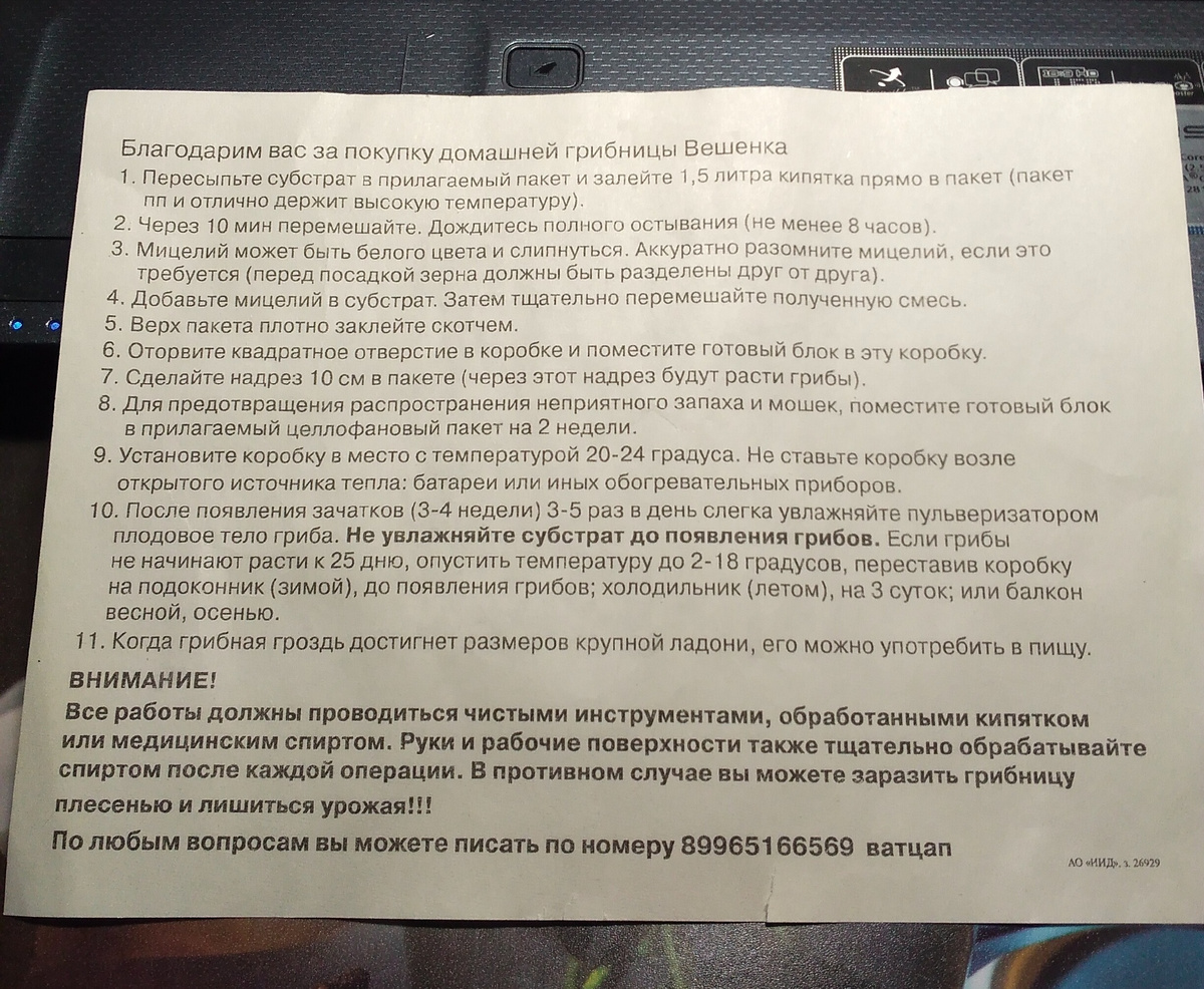 В комментариях меня спрашивали про выращивание грибов вешенок дома. Я этим не занимаюсь и вряд ли буду есть эти грибы, но у сына спросила, где он взял приспособления для выращивания грибов. Он сказал, что на «Озоне». Надо набрать в поисковике «вешенки», и вся информация появится. Кому интересно, я сфотографировала инструкцию по выращиванию вешенок.