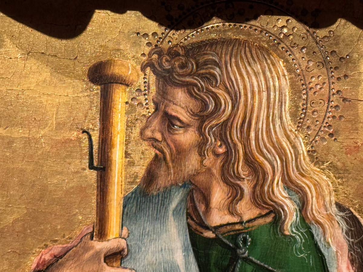 Что поражает? Объемность фигур при плоском золотом фоне. Кривелли как будто балансирует между Средневековьем и Возрождением.