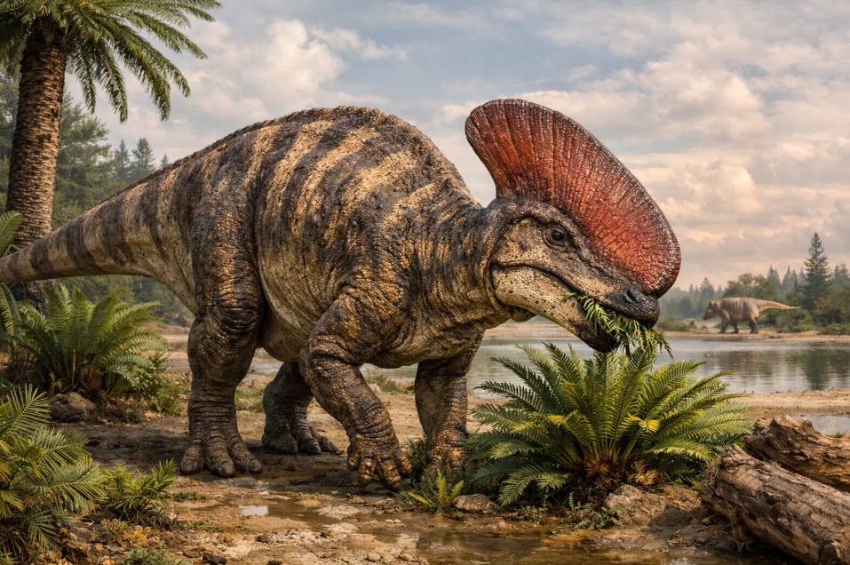 3. Терморегуляция. Эта гипотеза является предметом дискуссий, но её не стоит сбрасывать со счетов. Обширная поверхность гребня, пронизанная сетью кровеносных сосудов, могла работать как радиатор. В жарком и влажном климате меловой Северной Америки избыточное тепло тела могло рассеиваться через эту область, помогая гигантскому ящеру избегать перегрева. Возможно, гребень играл роль в согревании тела в прохладные утренние часы, когда кровь, протекающая через него, нагревалась под лучами солнца.