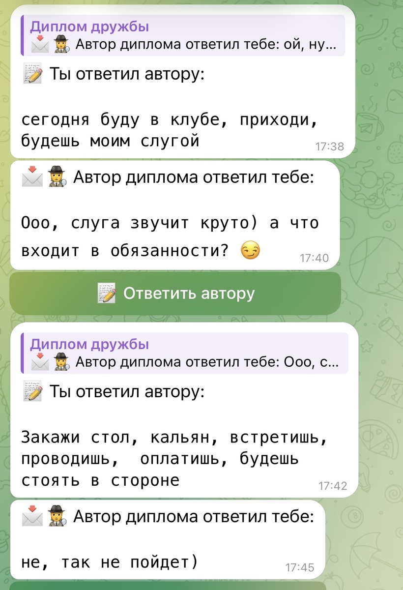 1. Виртуальное рабство как фантазийный конструкт. Его заигрывания, его признания, его игра в подчинение — это не предложение себя мне. Это — создание фантазийного объекта «Госпожи» в лице моей персоны, которым он полностью управляет в своем внутреннем театре. Он «служит» не моей воле, а своей идее моей воли. Например, он одевается с настройкой на то, как бы я оценила его образ, но фантазия рисует ему: «она увидит, как я круто выгляжу». Он даже может обыгрывать подчинение «моей воле», представляя, как я диктую ему «одень это», и он одевает это самое для «меня». Или он может смотреть на себя в зеркало и думать: «Нет, это ей не понравится, одену вот это.» Это абсолютно онанистический процесс: партнер нужен не как самостоятельная сущность, а как реквизит, как образ на экране сознания, который можно включить и выключить по желанию. Я описывала эти случаи: фото с ягодами, когда он решил за меня, как я буду рада и вовлекусь в виртуальную любовь. Все, что он делает, он делает для «меня» — для моего образа в его голове, каждый пост в своем канале для этого внутреннего образа меня. В своей фантазии он представляет мои реакции на эти посты. Например, он снимает себя за рулем и предвкушает, каким крутым я его за этим рулем увижу. Он накладывает музыку и предвкушает, как я услышу ее и выдам какую-то эмоцию, что-то о нем подумаю, отправлю ему телепатический ответ. Он фантазирует мои реакции (она видит, как я крут, и хочет меня!), не имея представления о их реальной природе — я не вижу в нем крутости, я вижу лишь жалкого дурака. Он страдает по мне и выкладывает посты, где он опухший страдалец, чтобы я увидела слезы его и пожалела. Все эти мои эмоции он себе представляет, и за счет этих представлений живет. Меня, по понятным причинам, это не устраивает, и я перекрывала ему каналы, чтобы он не брал на себя это право приписывать мне свои фантазии, и в ответ он устраивал гневные истерики, с более эмоциональными и взрывными песнями, адресованными лично мне. Например, на свое профессиональное видео, которое он якобы выкладывает для своих клиентов, для демонстрации своей профессиональной деятельности, он накладывает трек со словами: «Ху•ли ты палишь!» Он использует мой образ кошки в своих видео, чтобы влиять на меня, весь его личный канал в телеграм адаптирован под кошачью тему: разрешены реакции только из набора стикеров с кошками. У этих проявлений одна цель: «она увидит, что я использую кошек, и поймет, как она важна для меня.» Он лелеет мысль о своей фантазии, как я нежно воспринимаю его такую неземную любовь. Любовь действительно неземная — она психиатрическая.