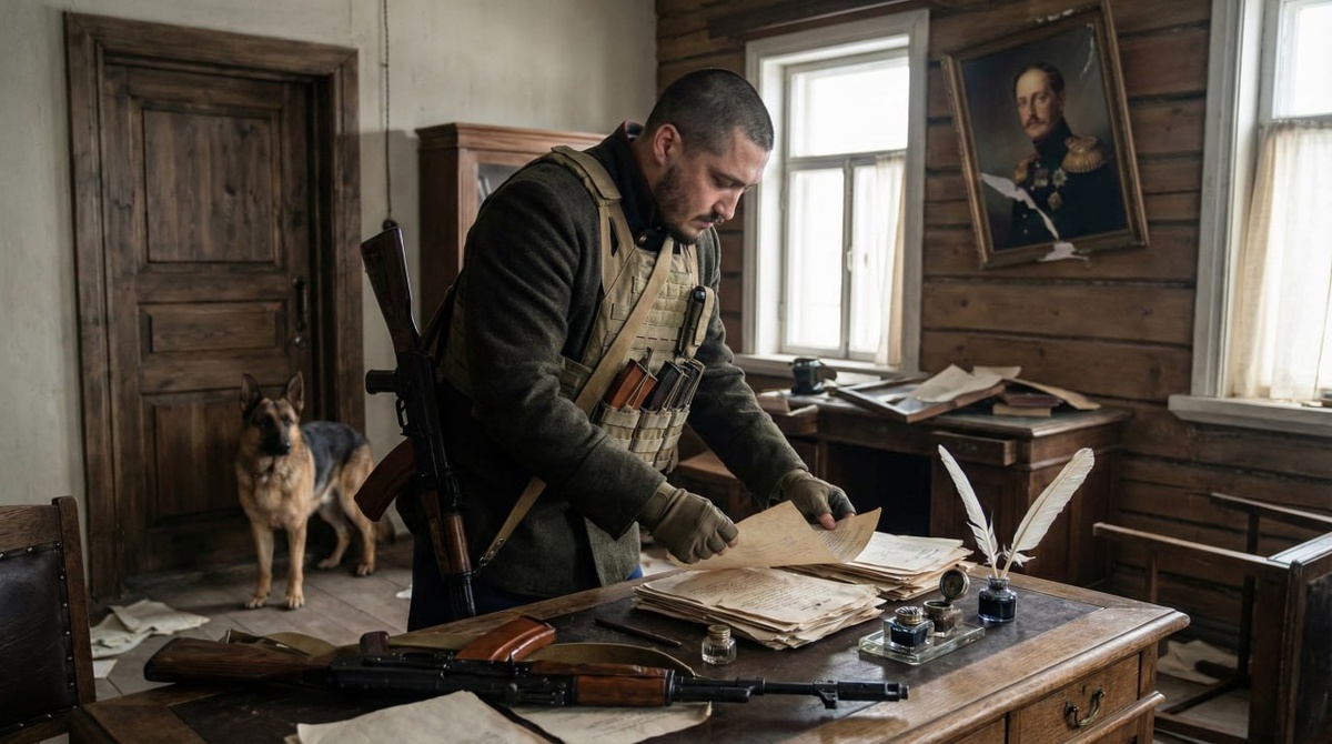 🔠🔠🔠🔠🔠🔠🔠 💀 Промт для мужиков из серии "Я легенда на Руси" 3 из 6 Cinematic 16:9 wide shot. Inside a ransacked 1830s Imperial Gendarmerie office. The soldier, fully geared in modern tactical vest over a period wool jacket, is carefully searching a heavy oak desk covered in quills, inkwells, and parchment documents. His AK-74 rests on the table. His German Shepherd stands guard at the heavy wooden door. A torn portrait of Tsar Nicholas I hangs crookedly on the wall. No zombies are present, but the silence is heavy. The soft light highlights the contrast between the tactical gloves and antique papers. --ar 16:9 Заказать промт или фотосессию. ✉️ Буст канала. ⚡️ Чат авторов для авторов ПОДАТЬ ЗАЯВКУ #нейросеть #aiфотосессия #промтыдляфотографа #мужскойпромт