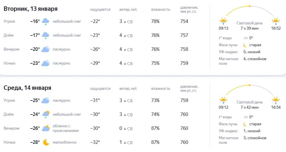 Синоптики говорят, что в ночь на понедельник в Челябинске будет идти слабый снег, но днем осадков не будет, температура воздуха составит -8° … -10°. А уже во вторник будет холоднее — до -17°, ночью около -25°. Среда тоже будет морозной — по данным Яндекс.Погоды, днем ожидается около -24°. Видимо, погода решила подбодрить всех нас после праздников, чтобы энергичнее до работы добирались