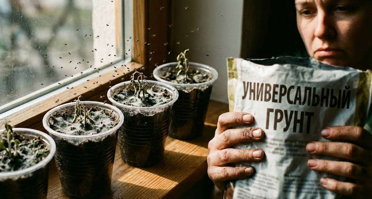 Я долго смеялась над людьми, которые покупают по 5 видов грунта "для томатов", "для перцев" и "для цветов". Я взяла один мешок с крупной надписью «УНИВЕРСАЛЬНЫЙ» — и решила, что умнее всех. Через неделю стало не до смеха: поверхность стаканчиков покрылась белым пухом, а над рассадой начали летать тучи мошек. Я устроила на подоконнике мини-болото. Сначала я грешила на семена. Но потом присмотрелась: мошки стартуют прямо из земли. Проблема была в пакете. Я сделала то, что делает большинство новичков: взяла грунт из пакета, насыпала, полила "от души" и накрыла пленкой.
