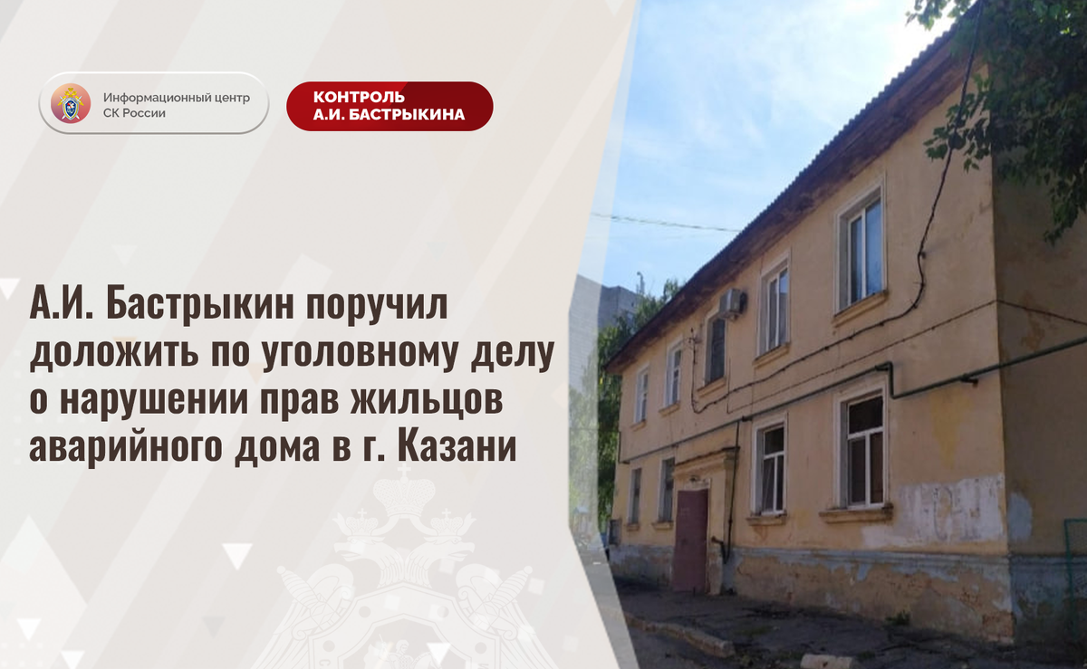 А.И. Бастрыкин поручил доложить по уголовному делу о нарушении прав жильцов аварийного дома в г. Казани В комментариях в аккаунте приёмной Председателя СК России А.И. Бастрыкина в социальной сети «ВКонтакте» опубликовано обращение по вопросу длительного нерасселения жильцов многоквартирного дома на улице Зур Урам города Казани. Здание 1958 года постройки ввиду высокой степени физического износа конструкций признано аварийным в 2021 году. До настоящего времени гражданам благоустроенное жилье не предоставлено, а земельный участок под строением и квартиры изъяты профильными структурами. Ранее указанная ситуация освещалась в СМИ. В СУ СК России по Республике Татарстан возбуждено уголовное дело. Председатель Следственного комитета Российской Федерации Александр Иванович Бастрыкин поручил руководителю СУ СК России по Республике Татарстан Валерию Андреевичу Липскому представить доклад о ходе и результатах расследования уголовного дела. Исполнение поручения поставлено на контроль в центрально