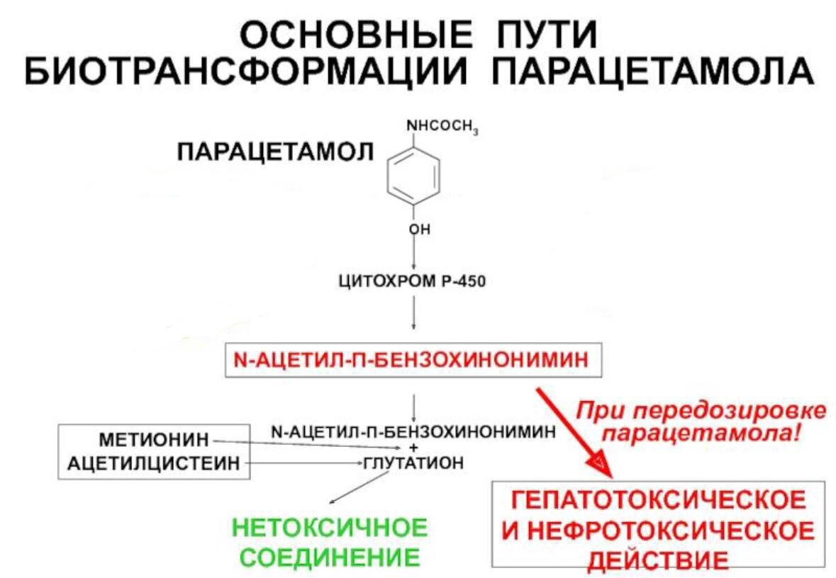 ПЕРЕДОЗИРОВКА Парацетамол - один из самых популярных НПВС в повседневной практике. Обладает выраженным жаропонижающим и обезболивающим действием, блокируя синтез медиаторов боли (простагландинов). Но❗️Парацетамол обладает узкой терапевтической широтой! Уже при превышении максимальной терапевтической дозировки в 2-3 раза происходит токсическое повреждение печени. С чем это связано❓ А связано это с тем, что биохимически некоторая часть парацетамола метаболизируется в печени до промежуточного продукта «N-ацетил-п-бензохинонимина» с помощью белка «Цитохрома Р450». Однако проблема в том, что именно этот метаболит токсичен ☢️ для гепатоцитов. В норме, данный промежуточный продукт эффективно обезвреживается, связываясь с глутатионом, и выводится из организма. Но, запасы глутатиона ограничены! А потому при приеме больших дозировок парацетамола депо глутатиона полностью расходуется, в результате чего начинает накапливаться токсический промежуточный метаболит. Именно он и приводит к повре