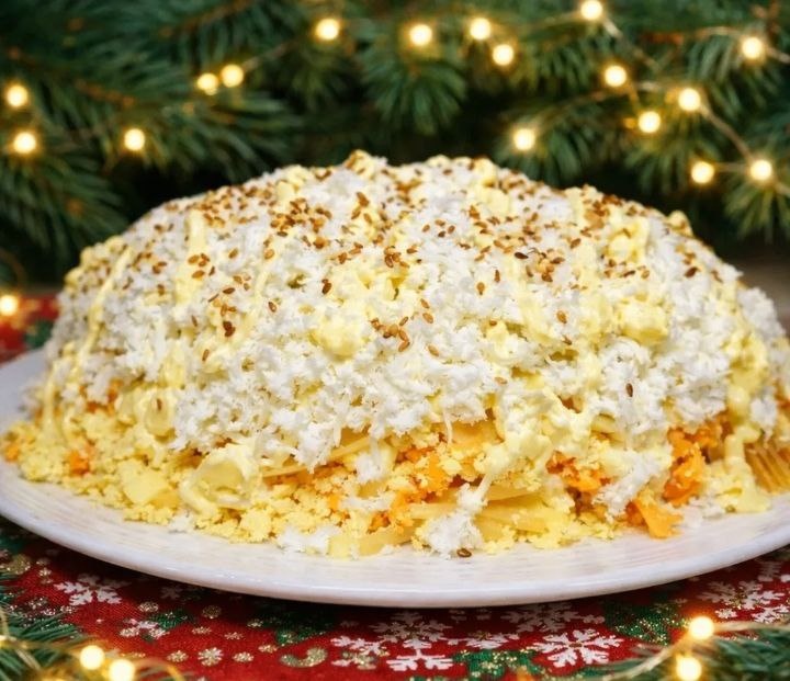 ИНГРЕДИЕНТЫ: ✅ Яблоко — 1 шт. ✅ Морковь — 1 шт. ✅ Сыр — 100 г ✅ Куриное филе — 1 шт. ✅ Чеснок — 1 зубчик ✅ Яйца — 5 шт. ✅ Жареный кунжут — по вкусу ✅ Майонез — по вкусу ✅ Соль, перец — по вкусу ПРИГОТОВЛЕНИЕ: 1. Куриное филе нарезать небольшими кусочками, обжарить до золотистой корочки. Посолить, поперчить и полностью остудить. 2. Морковь натереть на крупной тёрке, добавить измельчённый чеснок, заправить майонезом и перемешать. 3. Яйца разделить на белки и желтки. Желтки натереть на мелкой тёрке, белки — на крупной. 4. Яблоко натереть на крупной тёрке, сыр — на мелкой. 5. Собрать салат слоями: • Куриное филе + немного майонеза. • Сыр, затем морковь с чесноком. • Желтки + слой майонеза + яблоко. • Завершить слоем натёртых белков. 6. Сверху сделать сеточку из майонеза и посыпать жареным кунжутом. 7. Убрать салат в холодильник минимум на 3 часа для пропитки. СОВЕТЫ: ✅ Яблоко лучше использовать кисло-сладкое. ✅ Сочное яблоко слегка отжать от сока. ✅ Не перебарщивать с майонез