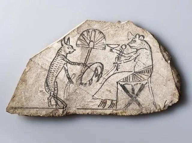 Этот черепок с кошкой и мышкой относится к эпохе XIX-XX династии, 1295-1075 гг. до нашей эры. Слева кошка передает мыши подношения: жареную утку и кусок ткани. Одновременно с этим кошка обмахивает мышь опахалом. Полагают, что это зарисовка к некоему сатирическому рассказу или часть утерянной истории. Экспонат можно увидеть в Бруклинском музее. Терра инкогнита | Неизвестная земля