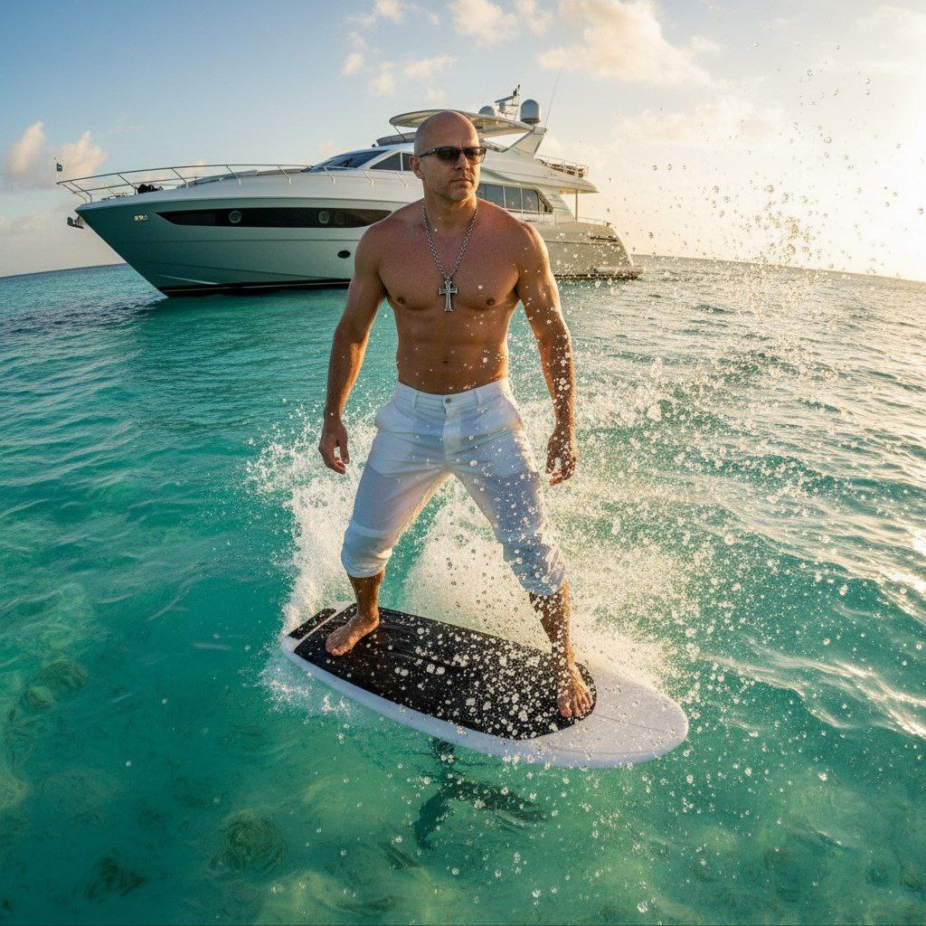легко скольжу на электрофойл-серфинге по кристально чистой тропической воде рядом с элегантной роскошной яхтой. Ракурс камеры: Низкий ракурс, чуть выше уровня воды, взгляд вверх, что придает телу мощный и доминирующий вид. Поза: Колени слегка согнуты, грудь открыта, руки расслаблены для равновесия, сильная атлетическая стойка, демонстрирующая плечи, грудь, пресс и руки. Брызги океана, поднимающиеся вверх к камере, динамичное движение, застывшее во времени. Кинематографическая широкоугольная композиция, легкий эффект «рыбий глаз», ультрареалистичное 8K, эстетика глянцевого журнала ➡️ Генерируем ТУТ 💵 Отблагодарить 💥boost