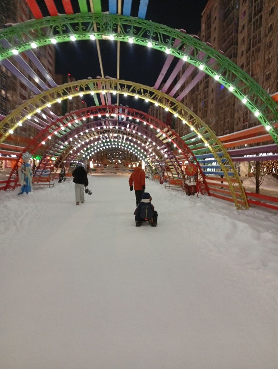 Но до катка мы всей толпой, включавшей в себя 6 взрослых и 3 деток, добрались только к закрытию, к 22 часам. Посмотрели, как там прикольно (а там катаешься вокруг красивющей елки, светящейся огоньками, и по ледяным дорожкам; играет музыка, приличный прокат коньков, начиная с двухполозных и р.25 для малышей, и зверей-держалок разного размера). Обсудили с работниками условия посещения (с 10 утра, как почистят лед, и до 22 часов, плата за вход и отдельно - за прокат, кому требуется) и отправились на холмы рядом покататься с горок, которых там большое количество. И много-много освещения (как и по всей Тюмени, кстати).