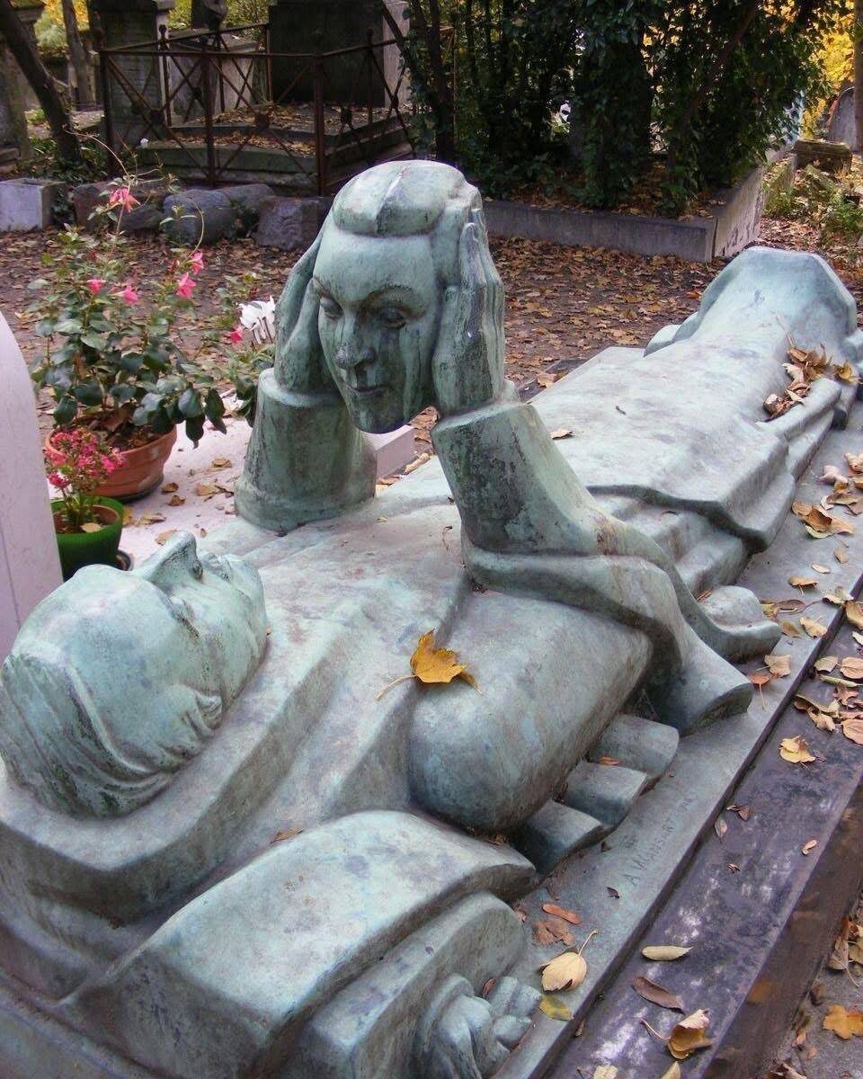 Могила музыканта и актера Фернана Арбело, который хотел навсегда видеть лицо своей жены после своей смерти в 1942 году. Гробница находится на кладбище Пер-Лашез в Париже.