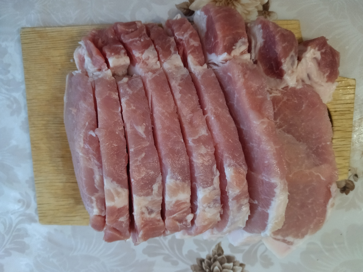 И так у меня был небольшой кусочек мяса, который я порезала на стейки толщиной плюс-минус 1 сантиметр.